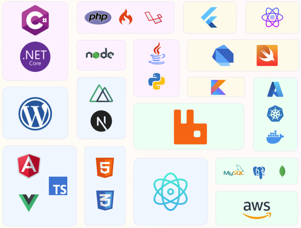 Pick the stack you use: .NET/Java/Node/Python, React/Angular/Vue, iOS/Android/Flutter, AWS/Azure/GCP—aligned to your architecture.
